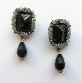 Both glamorous and preppy, these earrings consist of square black rhinestones surrounded by moonstone colored crystals with black teardrop rhinestones hanging. Enforced with black felt backing. Earring posts made of stainless steel.