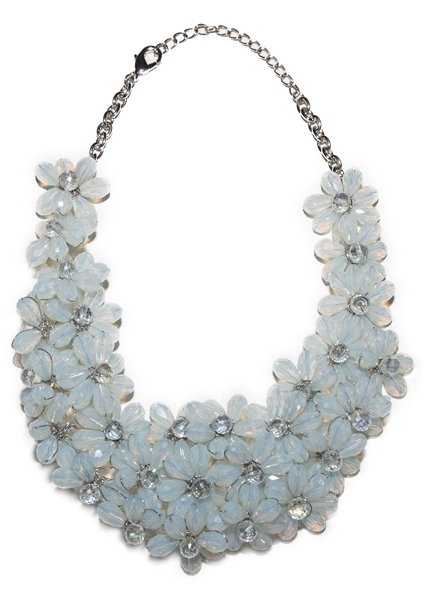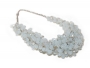 Stunning milky white crystals are wire wrapped together to form flowers accented with clear round crystals. Wrapped around a silver aluminum chain to form a thick U shape. Adjustable. Lobster clasp closure.