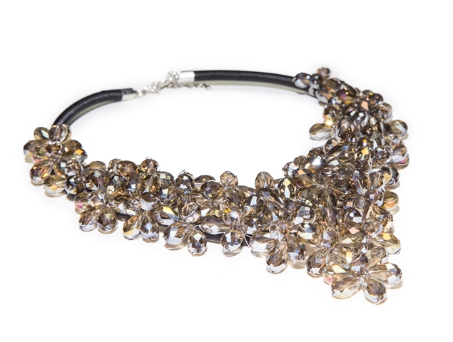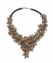 Teardrop shaped German crystals are artistically wired together to form floral designs delicately wrapped around a black cord. Drops to a V in the center. Lobster clasp closure.