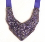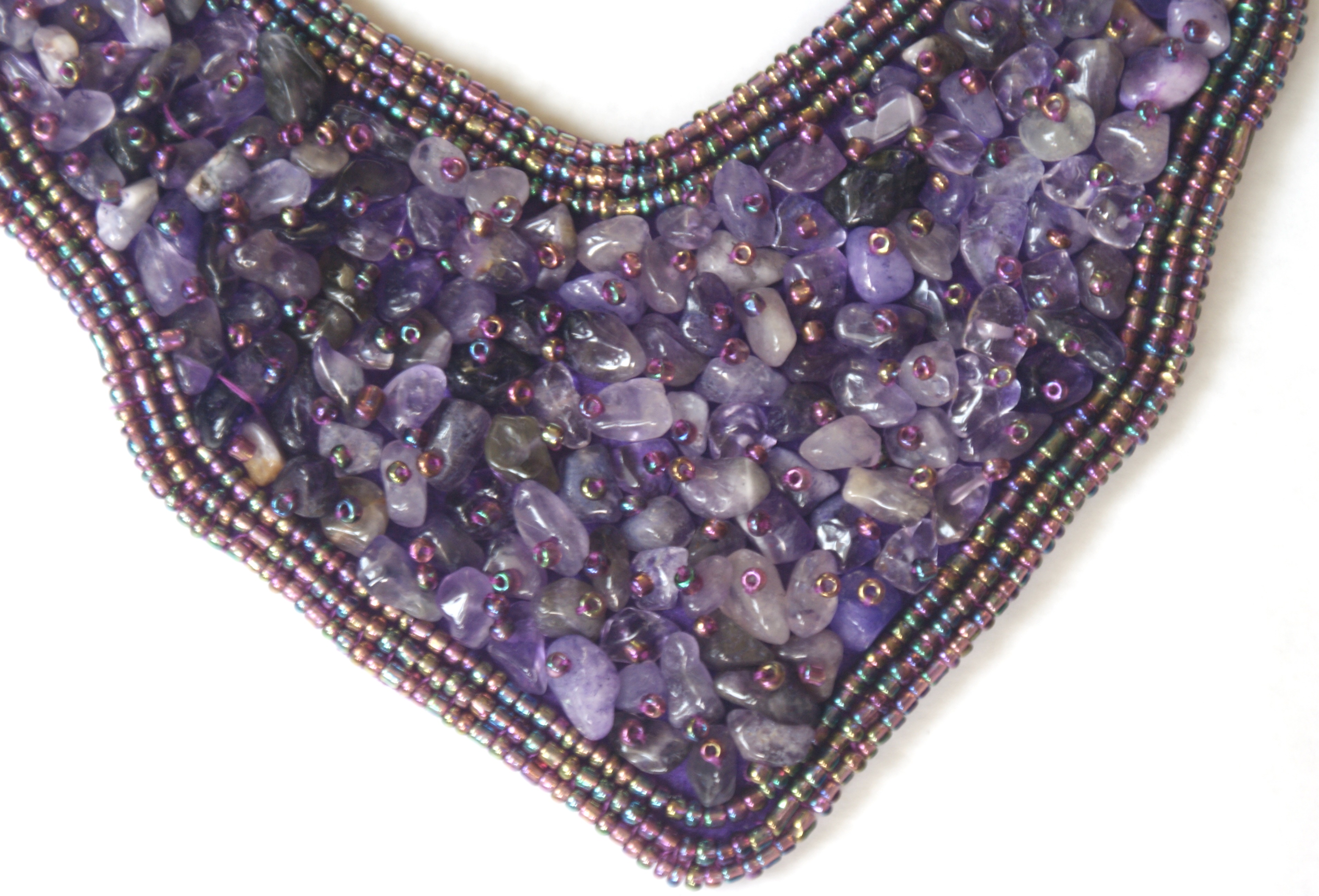 Bib necklace with amethyst chips accented by purple seed beads. Enforced with purple felt backing. Purple grossgrain ribbon makes this adjustable in length.