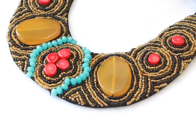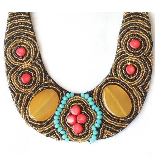 Bib consists of red coral stones and yellow agate accented by turquoise colored crystals and black and gold seed beads. Enforced with black felt backing. Antique gold toned chain.
