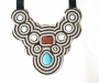 Bib consists of turquoise colored magnesite, square agate stone and round mother of pearl shells surrounded by black white and brown seed beads. Enforced with black felt backing. Black ribbon tie closure.