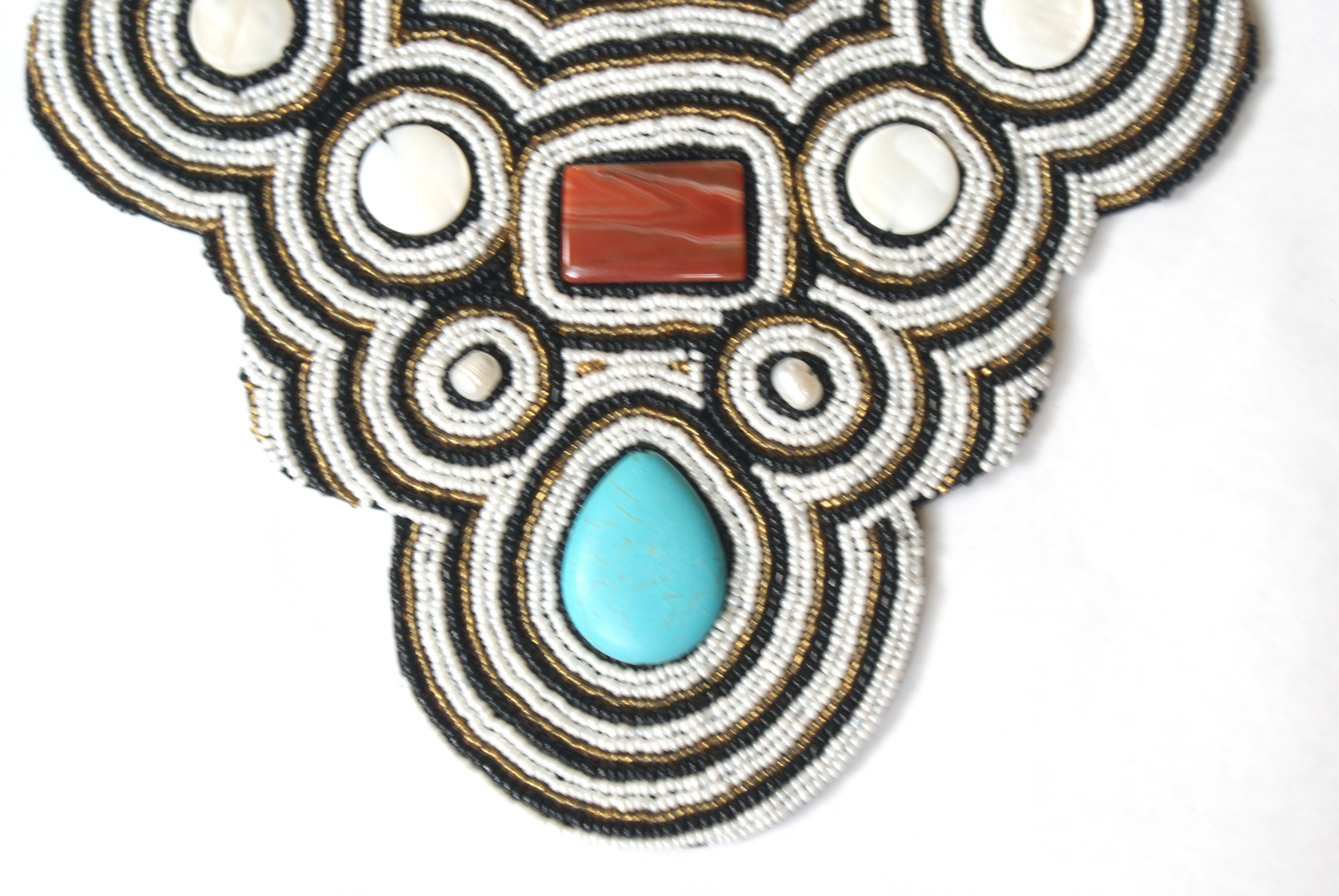Bib consists of turquoise colored magnesite, square agate stone and round mother of pearl shells surrounded by black white and brown seed beads. Enforced with black felt backing. Black ribbon tie closure.