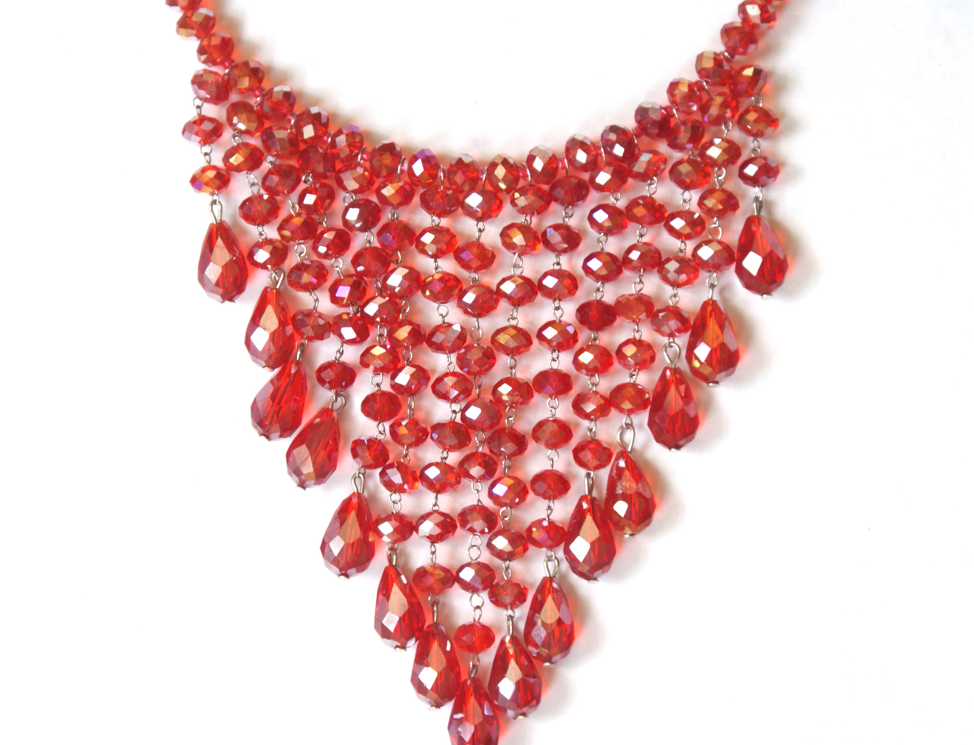 Choker consisting of red German crystals with base metal hook and eye closure, and strands of crystals draping down.