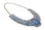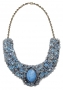 A collar length necklace featuring light blue moonstone chips with a center stone of bluelace agate, surrounded by dark multicolored and gold seed beadings. Lobster clasp closure.