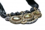 Hand beaded necklace with Czech crystals surrounded by copper and gunmetal grey crystals, accented with multicolored seed bead and bugle beads. Finished satin ribbon tie makes this piece adjustable in length.