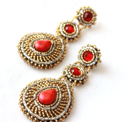 Three tier drop earrings with red rhinestones at top, dropping to a red colored magnesite stone at the bottom. All surrounded by gold seed and silver tube beading. Stainless steel post.