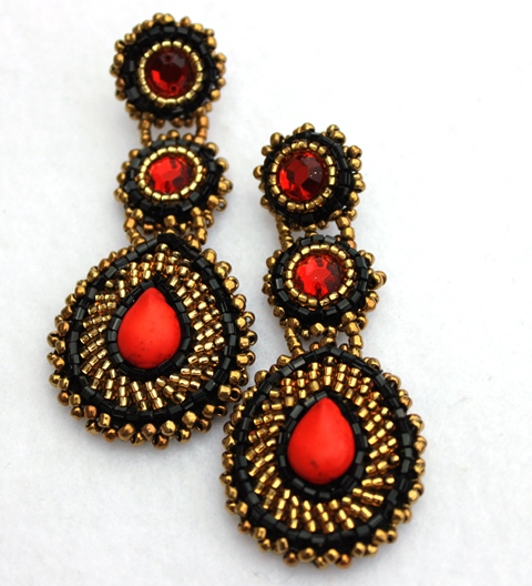 Three tier drop earrings with red colored magnesite stone and red crystal, surrounded by Japanese gold and black seed beading. Enforced with black felt backing. Stainless steel post.