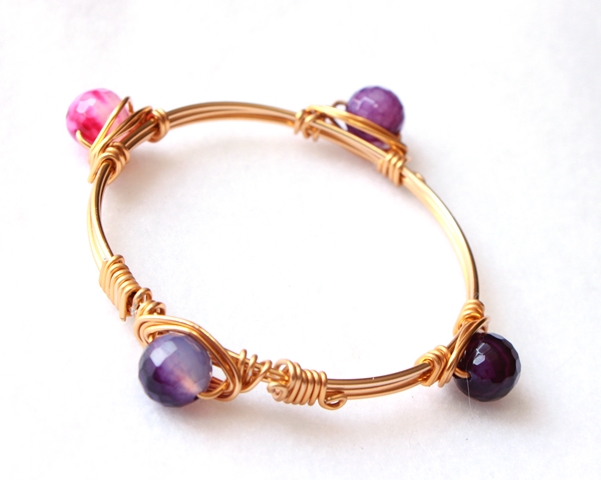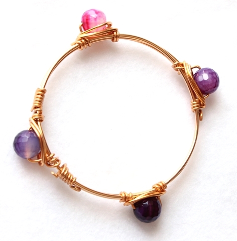 This gold plated aluminum wire bangle consists of four pendants of polished pink, light purple and dark purple agate. Perfect to wear solo or layered for a more stylized effect.