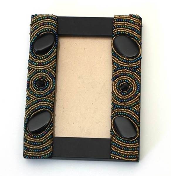 Perfect for gift giving, this statement frame is embellished with handsewn beading made of black onyx stones, iridescent crystals and multicolored seed beads. Comes with gift box for easy gifting.