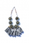 This necklace is a true attraction to the eye. Silver German crystals are showcased and surrounded by grey, gold, and black Japanese seed beads. Each pendant is surrounded by Silver German crystals and accented with hundreds of grey, white, and black tassel threads. Hangs from a rose gold and silver aluminum chain with rhodium lobster lock.