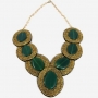 This hand embroidered bib style statement necklace consists of seven large genuine jade stones surrounded by gold Japanese seed beads. Enforced with black felt backing. Antique chain with lobster clasp closure makes this piece adjustable in length.