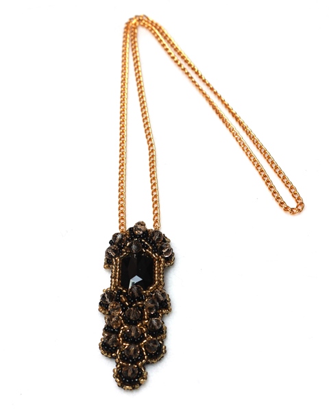 This necklace is made of intricate handsewn beading in black and gold, with pops of cocoa crystals, all centering around a black rhinestone to form a beautiful elongated medallion. Delicately hangs on a gold plated aluminum chain.