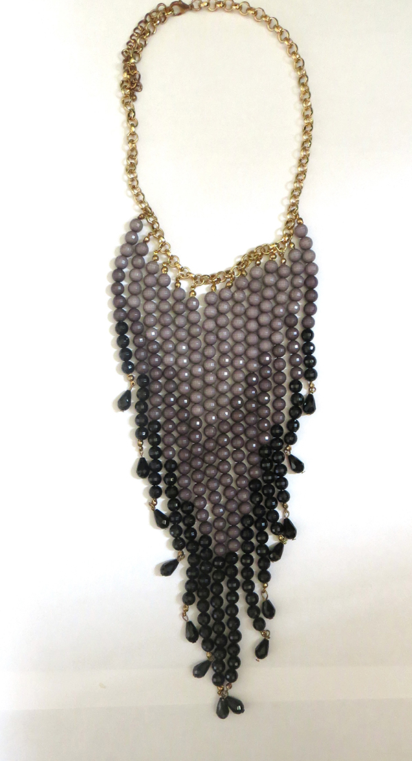 This waterfall necklace is comprised of various shades of purple acrylic beading, colored ombre style. Connected with gold toned chain. Lobster clasp closure.