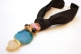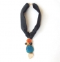 An art inspired necklace, this is made up of a wire wrapped pendant with raw edged blue agate, orange agate and quartz. Round onyx bead accents on side. On a black fabric choker with J hook closure.