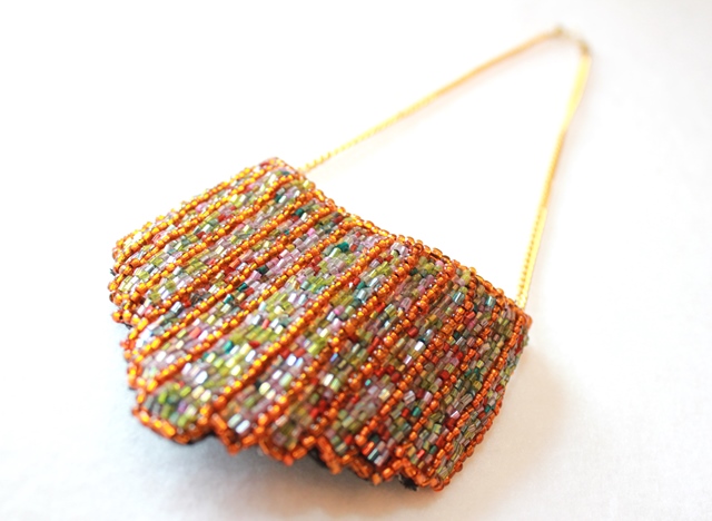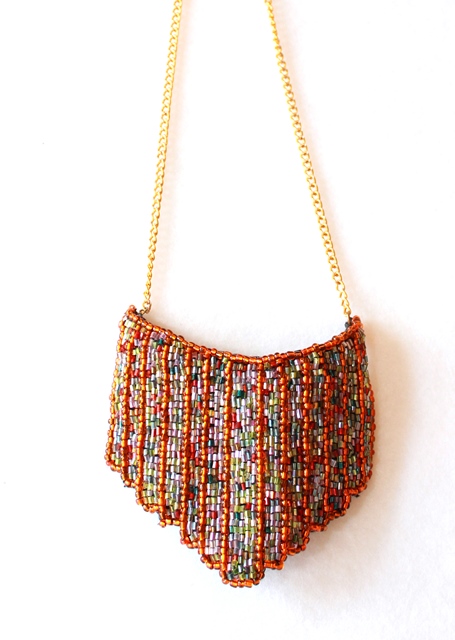 This all-handsewn necklace is a stunner; assorted multicolored cut beads adorn a plaque pendant, accented with lines of orange beading that get longer in the center, beautifully falling right by wearer’s collar bone. Hangs on a gold plated chain. Black synthetic backing. Lobster clasp closure.