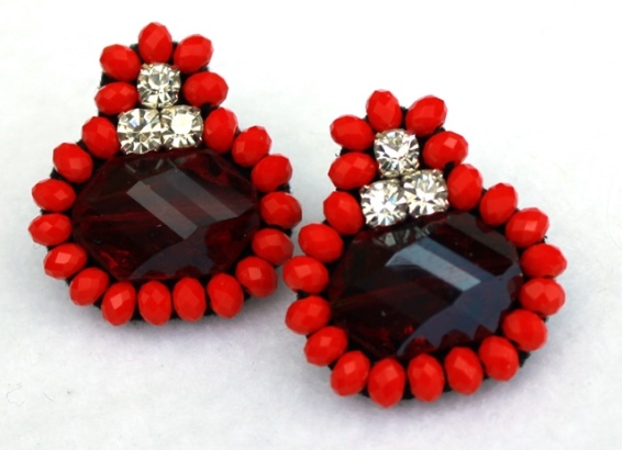 Stud earrings showcasing red rhinestone surrounded by red bead accents and crystal. Enforced with black felt backing. Stainless steel post.